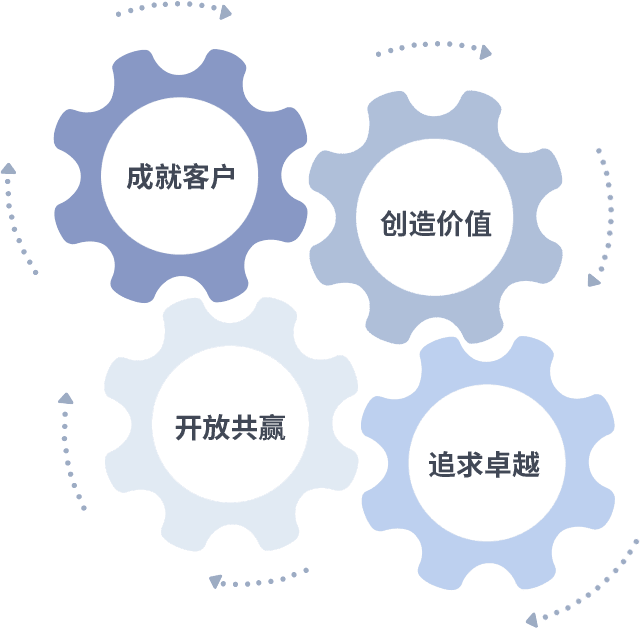 成就客户是一切决策的出发点,,创造价值是衡量所有工作的标准,,追求卓越是我们做事做人的态度,,,开放共赢是我们的格局也是最终的结果。。。。价值观的齿轮环环相扣,,,推动着组织里的每个人不断向前。。